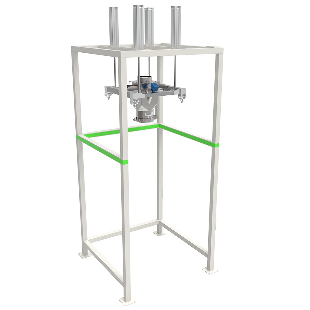 El big-bag se engancha en la estación a través de cadenas ajustables y se fija a la sonda de entrada del big-bag, cuando se completa el llenado el operador puede retirar el big-bag lleno. La estación modular de llenado de big-bags FBB puede manejar una variedad de tamaños diferentes de big-bags.