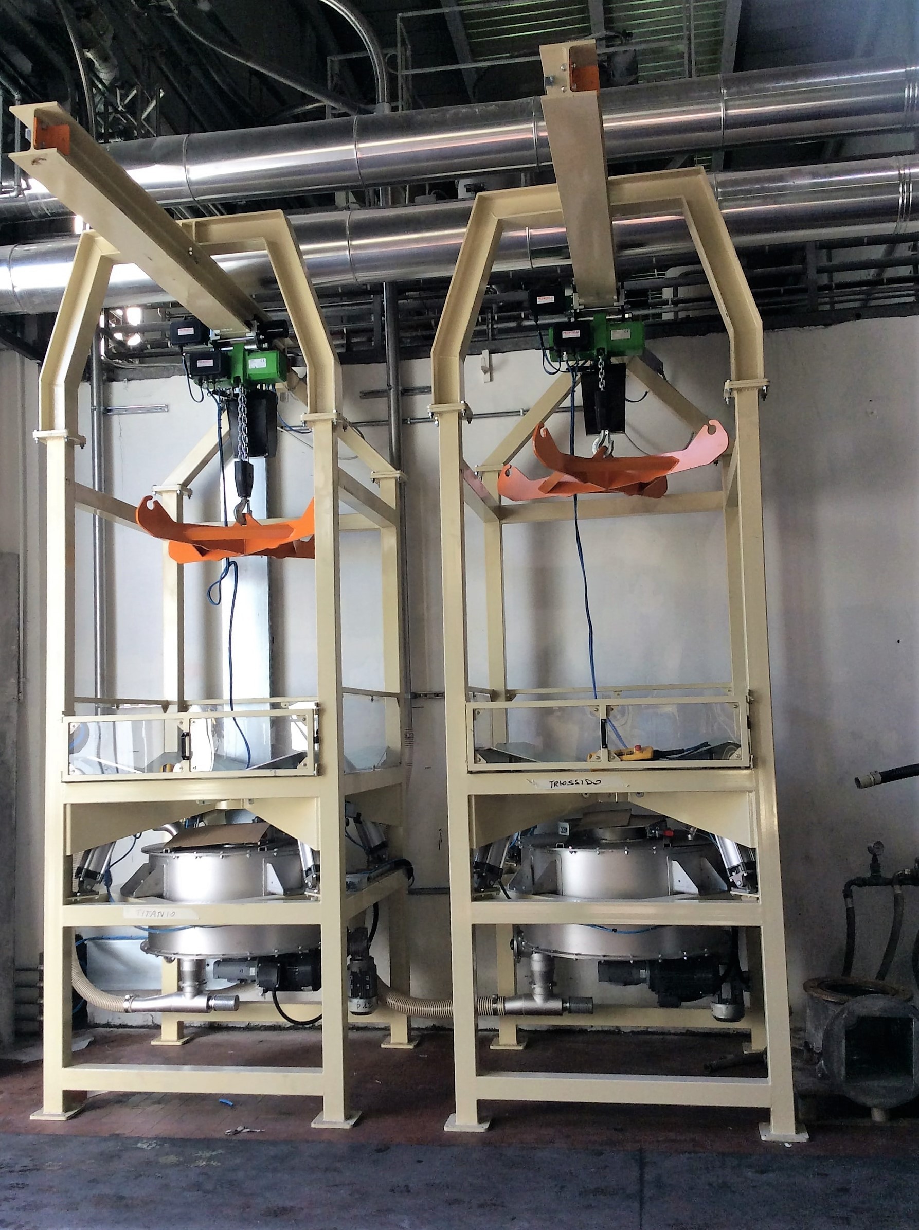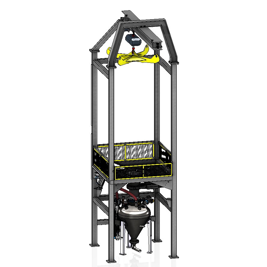 La estación de big-bags vacíos de la serie DBB-P está diseñada con un bastidor capaz de albergar big-bags de diferentes tamaños de hasta 2500 mm de altura, 1300 x 1300 mm de ancho y hasta 1500 kg de peso. El big-bag se engancha a un bastidor y con un polipasto eléctrico de cadena o una carretilla elevadora, según la versión, se coloca en la parte superior de la estructura por encima de la tolva de descarga.